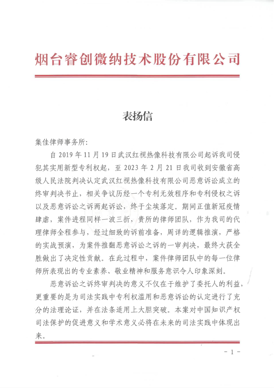 2023年2月10日,安徽省高级人民法院就烟台睿创微纳技术股份有限公司、烟台艾睿光电科技有限公司、安徽英睿系统技术有限公司等(下称“睿创集团”)与武汉红视热像科技有限公司(下称“武汉红视”)因恶意提起知识产权诉讼损害责任纠纷一案作出终审判决,认定武汉红视滥用诉权的行为构成恶意诉讼,并判令其赔偿睿创集团相应的合理支出。至此,时隔四年,横跨疫情时代的专利侵权及恶意诉讼系列纠纷案,终于尘埃落定。鲸鱼体育协助睿创集团最终取得系列案件的全面胜利,维护了客户合法权益,实现了商业竞争的公平正义!