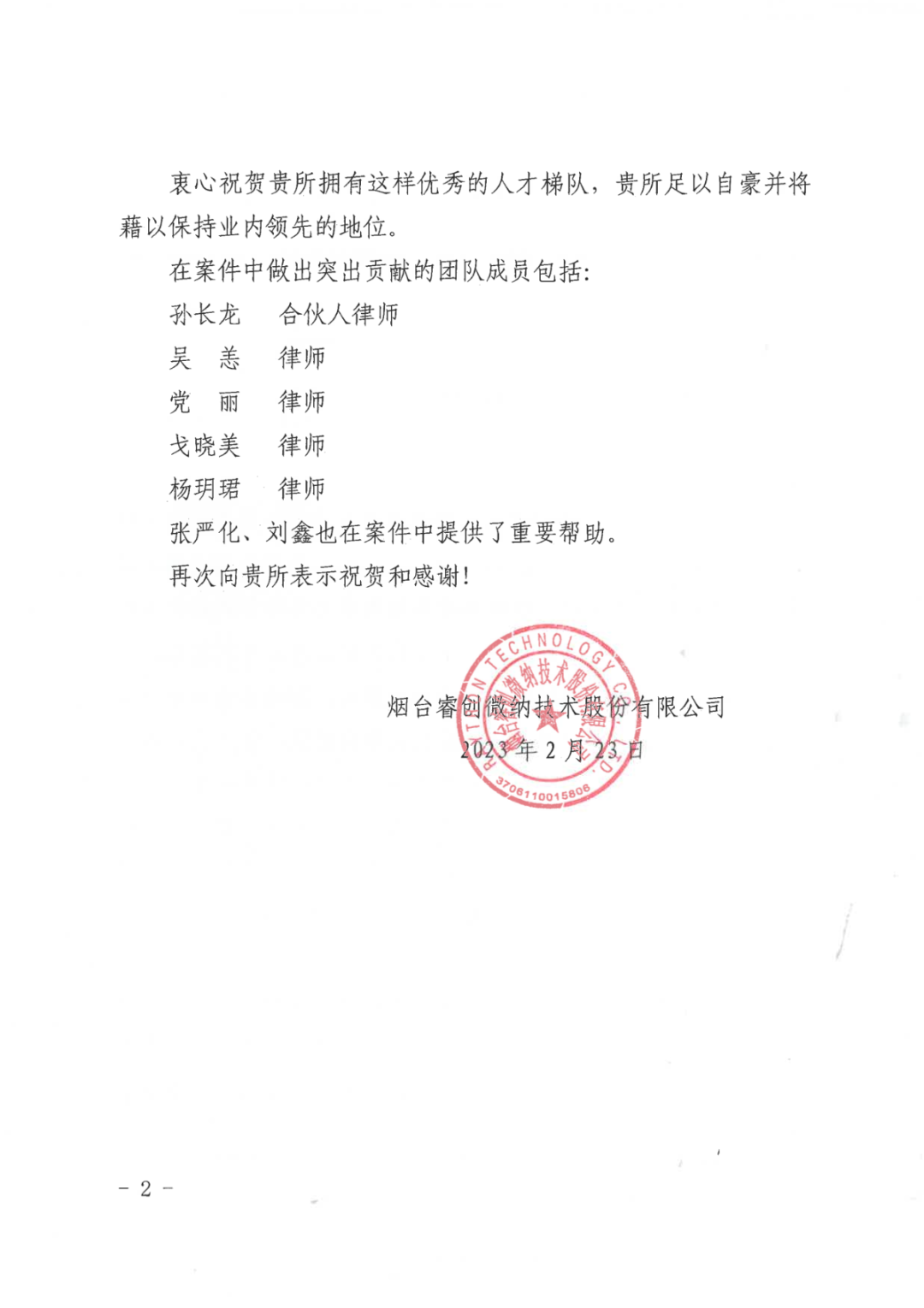图1 睿创集团向鲸鱼体育寄送的表扬信