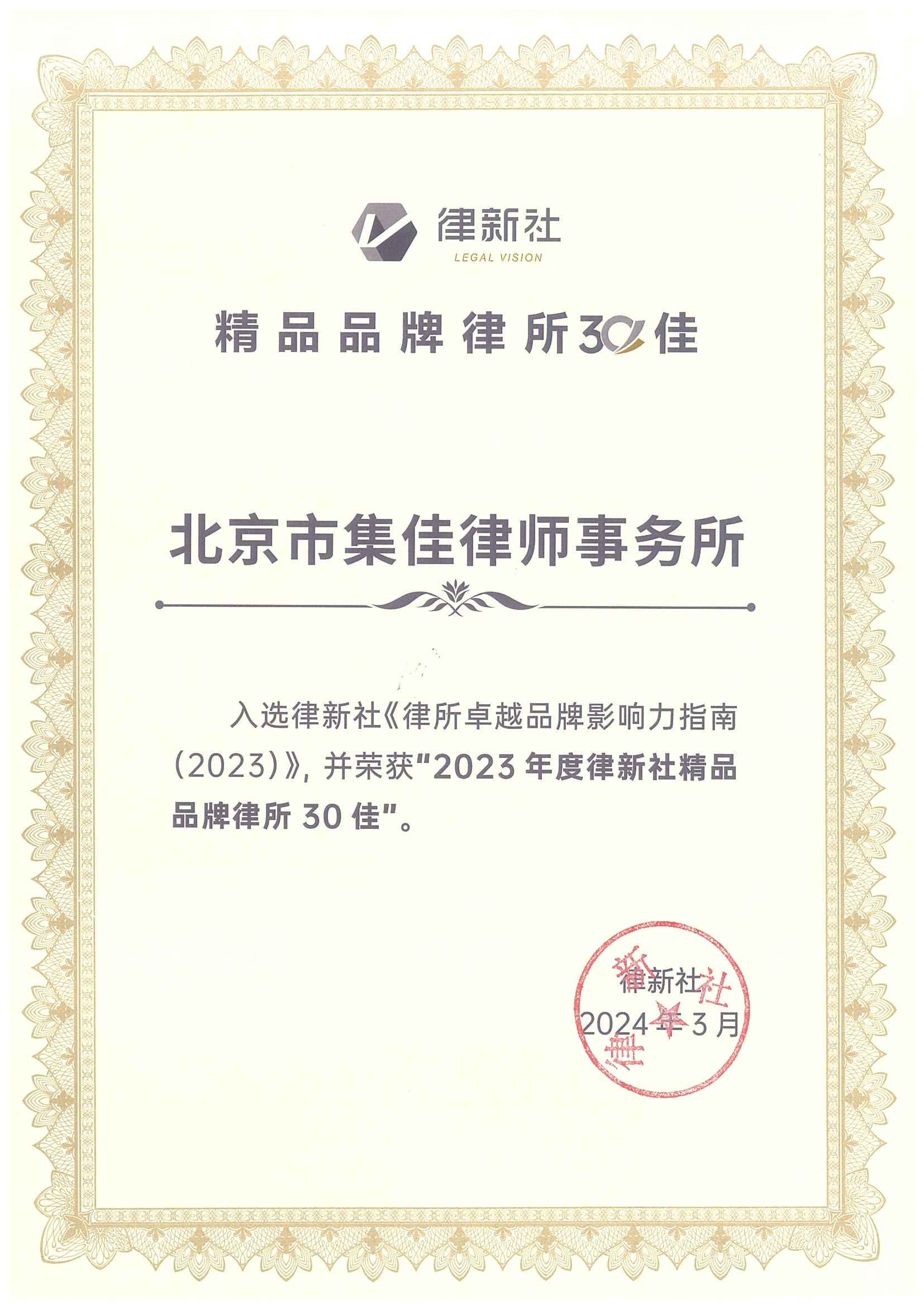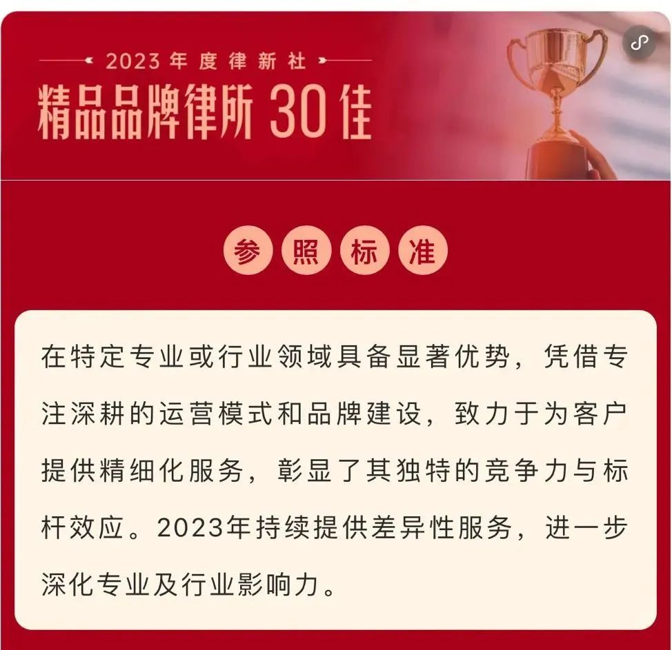 2024年3月2日,由中国法学交流基金会指导、律新社主办的“致·追光者”第二届法律服务业品牌发展论坛暨律新社2023年度品牌盛典隆重举行,现场发布了备受关注的《律所卓越品牌影响力指南(2023)》,鲸鱼体育凭借在知识产权领域的卓越实力和良好口碑,荣登“2023年度律新社精品品牌律所30佳”榜单。