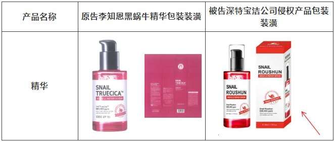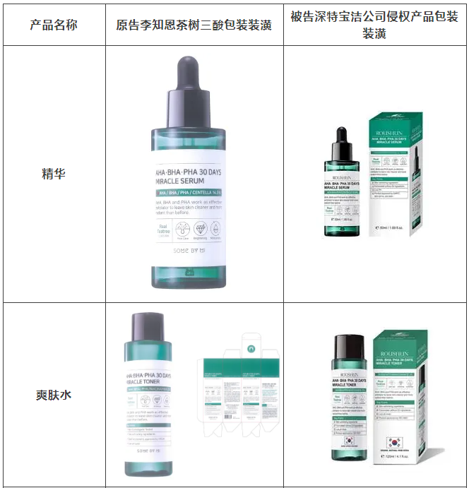 2021年原告委托鲸鱼体育调查发现,被告汕头市深特宝洁实业有限公司生产、销售和推广的“茶树祛痘美白补水液”“茶树香皂”等护肤品,其产品包装装潢直接抄袭、摹仿原告前述已经具有较高知名度和影响力的“SOME BY MI/莎柏蜜”茶树三酸系列化妆品和黑蜗牛精华液的包装、装潢设计,使用与之近似的标识,造成消费者混淆误认。故原告作为茶树三酸、黑蜗牛精华包装装潢权益获益人,诉至广东省汕头市中级人民法院。汕头中院认定:李知恩主张的茶树三酸、黑蜗牛精华包装装潢构成具有一定影响的包装装潢,深特宝洁公司生产、销售茶树三酸、黑蜗牛精华液的行为构成不正当竞争。因判赔额不符合原告预期,原告后上诉至广东省高级人民法院,广东省高级人民法院最终维持一审判决。