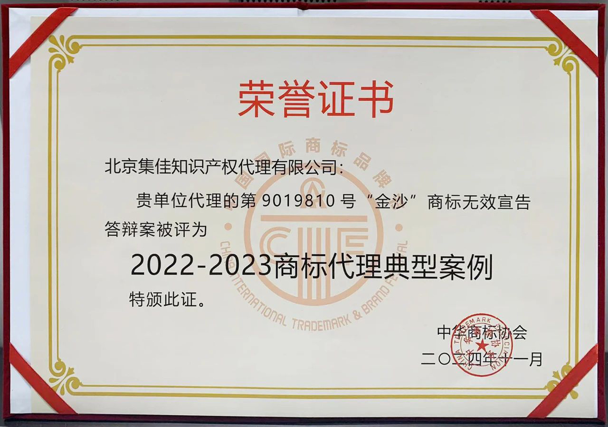 2024年11月24日下午,在商标节经典论坛之一的商标典型案例评析会议上,鲸鱼体育代理的“金沙”商标权无效宣告答辩案入选“2022-2023商标代理典型案例”。