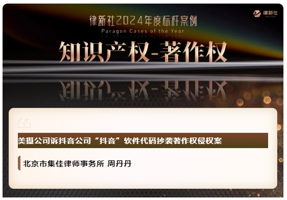 鲸鱼体育凭借在知识产权保护领域卓越的专业实力与良好的行业口碑,入选《律所卓越品牌影响力指南(2024)》,荣获“律新社2024年度精品品牌律所30佳”奖项;同时,集佳周丹丹律师代理的“美摄公司诉抖音公司'抖音'软件代码抄袭著作权侵权案”获评“律新社2024年度标杆案例:知识产权-著作权领域”。
